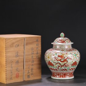 旧藏 明代 嘉靖红绿彩海水云龙纹大盖罐