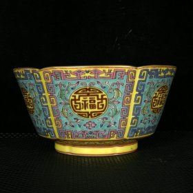 清雍正年柠檬黄釉粉彩福寿纹碗4.5*8.5m1400¥