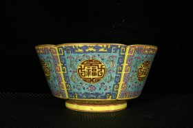 清乾隆绿地珐琅彩描金福寿纹瓜棱碗