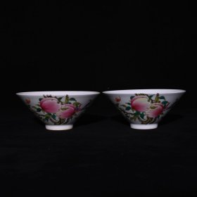 清雍正年制粉彩福寿纹斗笠碗一对,高6.8×15.3厘米