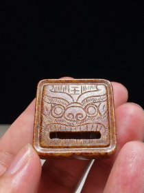 明 和田玉籽料 白玉沁色 兽首饕餮纹 八方 玉佩 挂件 把件 长5.2 宽5.2 厚1.2厘米 重51.4克 和田籽料为材,致密莹润,局部黄褐沁色,沁色斑斓,包浆老旧,古意盎然。圆雕八面饕餮兽面纹,两两对称,兽首形象威严霸气,极富立体感。中间以压地隐起技法浅浮雕饕餮纹为饰,刻划雄健而庄严。整体线条流畅,造型端庄,亦有上古之风,殊为少见,独特难得,适合佩戴把玩。