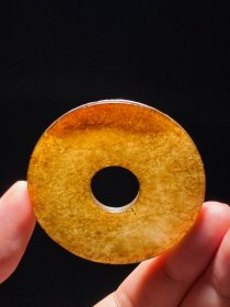 汉 和田玉籽料 沁色 勾连纹 玉璧 玉佩 挂件 直径5.6厚0.4厘米 重21.1克 玉璧和田籽玉,通体泛深熟斑斓褐沁,包衣古穆,盘玩老熟,皮色深沈,古意盎然。正面游丝毛雕勾连纹弦纹。造型美观大方,历史悠长,保存完好,古朴独特,适合收藏佩戴。