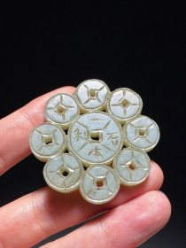 清 和田玉籽料 钱纹 钱形 古钱 玉佩 挂件 长5.3宽5.3厚0.6厘米 重29.3克 此件钱形佩,由八小一大九枚古钱组成,每枚古钱外圆内方,两面钱廓与穿孔四周阶起宽唇,钱廓与穿孔之间则减地一层。阴刻“一本万利”“天下太平”吉语,为古时民间流行的典型性的吉语钱,乃清代之物。