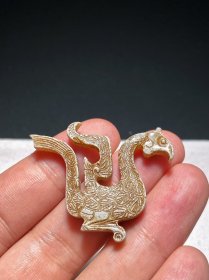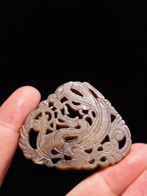 明以前 和田玉 透雕 凤形珮 挂件 长4.4 宽0.6 高3.5厘米 重8.4克 器物小巧精致,和田玉质,沁色入骨。玉佩透雕一只凤鸟,勾喙,卷尾,通体细阴线均以磨刻方法琢饰,线条流畅自然,符合战国玉器特征。