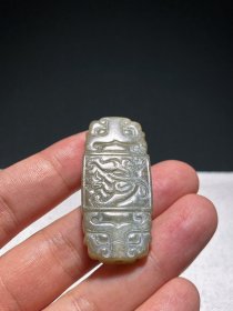 明以前 和田玉籽料 兽面纹 螭龙纹 玉佩 挂件 吊坠 长4.8 宽2.2 厚0.7厘米 重16.4克 和田籽料玉质,局部受灰白色沁。扁平长方形,上下两端对钻一穿孔。两端浮雕兽面纹,其上兽角略大,眼鼻突出,五官紧凑,表情严肃,显出立体效果。中间阳刻螭龙纹,宽额方嘴,水滴形眼,眉毛细长灵动,双耳向外,龙角后倚,面部刻划细腻生动,眉眼、毛发等细节表现一丝不苟。玉佩造型古朴,极富神秘韵味。