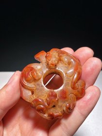 战汉 红缟玛瑙 高浮雕 龙凤纹 鸡心佩 韘形玉佩 挂件 玉佩 长6.2厘米 宽5.8厘米 厚2.1厘米 重52.6克