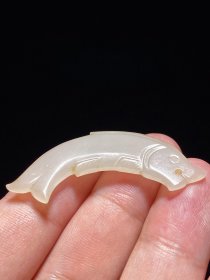 明以前 和田玉籽料 白玉 鱼形 挂件 玉佩 长5宽2厚0.5厘米 重6.1克 和田籽料白玉,玉质熟润,柔和莹润。器扁平,体薄,鱼弓身收尾,首下视,作腾跃状,动感十足。管钻圆眼,口微张,上吻突出,唇平,口角处有双面对钻孔,用双阴刻线饰腮部。玉鱼腹、尾及背鳍均先刻框,后填短阴线,短阴线平行排列,是商周时期玉鱼贯用的技法。