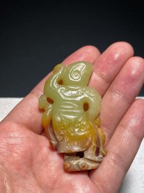 明 和田玉籽料 黄玉 善财童子 玉佩 挂件 把件 长3.7 宽1.2 高6.4厘米 重39克 和阗黄玉质,温和光泽,局部带沁,玉质温润,包浆醇厚。整体为立体圆雕,局部为镂空透雕,细部为阴线勾勒。童子站立在飘浮的云彩之上,呈舞蹈姿态,有飘带自肩部缠绕,灵气十足,衣衫随风飘逸,一副怡然自得、天真自信之态。此作雕琢精湛,布局妥贴,手法写意,张驰有度,审美品位颇高。体现盛世之衣冠文化与精神内涵。