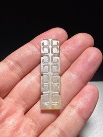 汉 和田玉籽料 白玉 勾云纹 玉饰 玉佩 挂件 把件 长1.4宽0.6高5.1厘米 重8.6克 籽料白玉质,光滑细腻,光气摄人,包浆厚重,过渡自然,油性十足。玉勒雕琢勾云纹装饰。勾云纹,一种是阴线碾琢的小勾云纹,均流行于战国至汉代。勾云纹刻画饱满,正反相连,排列密实,是典型战汉时期贵族身上玉组佩的玉饰之一。