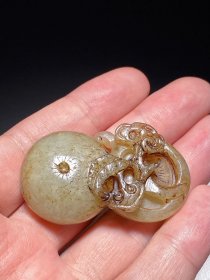 明 和田玉籽料 白玉 沁色 君子如意 玉佩 挂件 长5.2 宽1.2 高3厘米 重28.4克 此佩和田白玉质,玉质细腻,局部黑褐沁色,包浆浑厚,油性十足。雕刻两朵菌菇,谐音君子之意。君子比德于玉,自古中国人就把和田玉比喻为君子,以玉的高尚德行衡量人的品德,此佩正是此类修身器物,时刻提醒佩戴者要具备玉的高尚品行,是一件非常值得收藏佩戴的玉器。