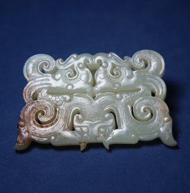 唐 和田玉籽料 透雕 沁色 龙纹珮 玉珮 挂件 长5.6宽0.5 高4.7厘米 重19克 和田籽料玉质,玉质致密,通体受沁,沁色斑斓,包浆莹润。透雕龙纹,龙首居中,头部微昂,唇口上翘玉佩雕工精美,富于想象,在吸取线剖和圆雕技术的基础上,采用镂刻艺术,为唐代玉龙装饰艺术的上乘之作。龙,是我国古代传说中一种善变化、兴云雨、利万物的神异动物。早在我国原始社会晚期,龙就作为一种图腾受到氏族部落的崇拜。