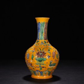 娇黄釉珐华彩莲池鸳鸯纹瓶 高22.5厘米 宽13.5厘米