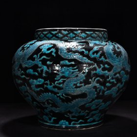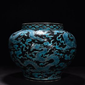 瓷器 明永乐珐华彩黑地孔雀蓝釉龙纹罐 高330.5厘米 宽39厘米