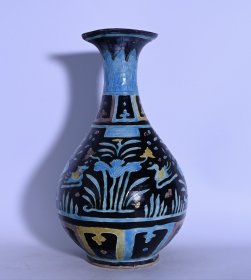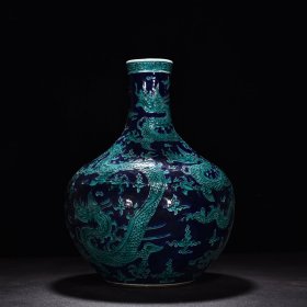 瓷器 明永乐黑地珐华彩孔雀蓝釉云龙纹天球瓶 高45厘米 宽30厘米