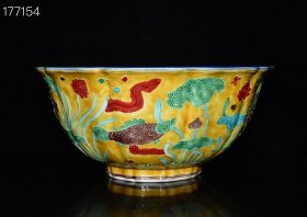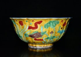 明代宣德霁蓝釉珐华彩鱼藻纹瓜棱碗【10.3×22.7cm】