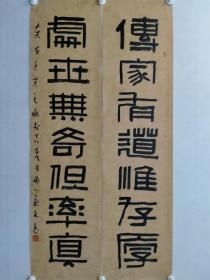 保真书画,覃业文书法对联一幅,尺寸:138×34.5cm×2软片,覃业文,陕西书协隶书专业委员会副主任,第三届中国书法兰亭奖“艺术奖”获得者,全国第二届篆书展一等奖获得者,全国第二届隶书展一等奖获得者