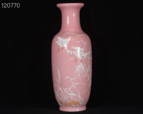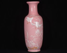 价格2100元. 民国竹溪道人王步绘胭脂红釉堆雪工艺芦塘归雁图灯笼瓶. 高40.5径14厘米1.