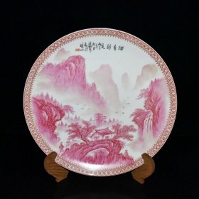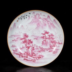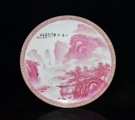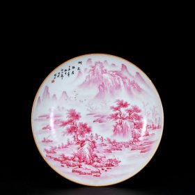 民国汪小亭作胭脂红山水纹盘子;4.5x22.3;857008440uud