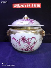 598_旧藏民国胭脂红描金开窗山水人物粥罐,
