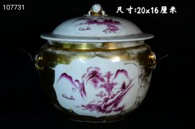 322_旧藏民国胭脂红描金开窗山水人物粥罐,