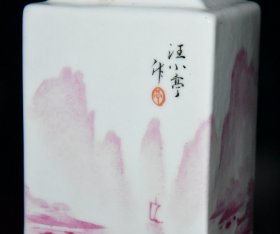 民国汪小亭胭脂红山水四方小瓶一对【17.8x7.3cm】
