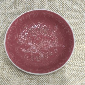 民国胭脂红暗刻龙纹小碟
