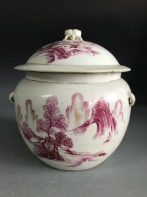 民国胭脂红釉山水纹粥罐