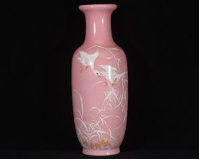 民国竹溪道人王步绘胭脂红釉堆雪工艺芦塘归雁图灯笼瓶. 高40.5径14厘米1.