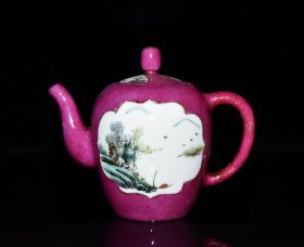 瓷器 民国胭脂红开窗粉彩山水壶【11.5x14cm】