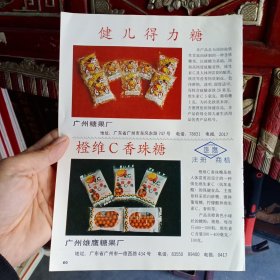广州糖果厂生产健儿得力糖,广州雄鹰糖果厂生产橙维c香珠糖。昆明南坝食品厂生产多味瓜子,上海塑料制品十七厂生产拉伸网,双色网有上海老酒图片。80年代广告彩印一张
