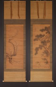 明末清初日本名家 上野若元,松竹梅 双幅对,【上野若元】1668-1744 江戸?中期の画家。長崎漢画派のひとり。寛文8年生まれ。長崎の人。本姓は小川、上野家に養子に入った。河村若元?とも称した。諱は道英、名は道昌、道英。別号に痴翁、篁洲、梅久軒、華山、蘭栄などがある。山本若麟は実子。元?禄年間、鍋島綱茂に絵師として抱えられたが、のちに長崎に帰った。花鳥・山水・人物画などにすぐれた。