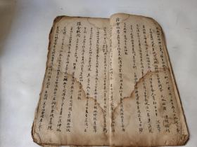 大开本道教手抄秘本,全书25个筒子页50 面,行楷精抄阴阳会短意、赦关、榜意,大放铁锁玉阳宫牒,贩孤、荡积、先日、次日、请水、召亡、开辟破狱、食曹祭夫牒尾,司、庙、土、县、阴、阳运曹,上中下皇元表,大圣灵宝三宣词,水火德表,三官仙娘,送曹司命劄,石鬼魁罡,马魂开路,破蝗虫大法,送回禄选舟等等,内容珍贵