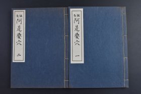 (庚4035)《针灸 阿是要穴》线装五卷2册全 洛下 法桥 冈本为竹一抱子撰 门人 长州 荻熊谷顺安竹隐 防州熊毛 末兼原端向荣同校 元禄第十六癸未季青阳吉祥日 复刻本 1976年 阿是穴,穴位分类名,又名不定穴、天应穴、压痛点。这类穴位一般都随病而定,多位于病变的附近,也可在与其距离较远的部位,没有固定的位置和名称。它的取穴方法就是以痛为腧,即人们常说的“有痛便是穴”。尺寸 23*17CM
