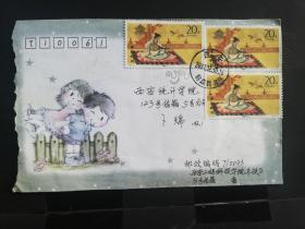 编年封:正贴1994-10王昭君2-1三连票,美术图案男女小卡通小朋友,西安工程科技学院到西安统计学院,2001年12月10日,双戳清晰,gyx221001