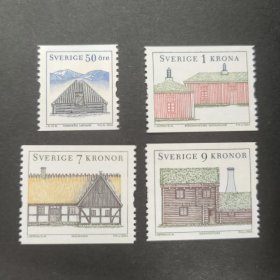 S505瑞典2004年11月11日。乡村住宅民居(第三组) 拉普人的木屋/矿工农庄/美丽农庄/位于布莱金厄的房屋 雕刻版外国邮票 新 4全 如图