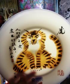 黄永玉老人家书画赏盘《虎》,印画+手绘,题拔为:"人打孩子,老虎不打孩子“,2007出品。顶级矿物颜料,绘画部分和空白部分都透光。用料是洪江民营瓷厂库存高纯度大球泥,瓷质如玉。具有收藏价值。