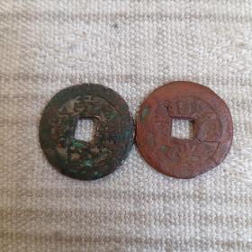 两枚稀罕的新疆红钱合售其中一枚乾隆通宝山底隆背月另一枚道光通宝背八年当五都非常少见放漏出