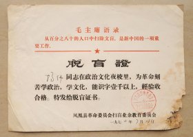 毛主席语录 脱盲证 凤凰县革命委员会扫盲业余教育委员会 凤凰