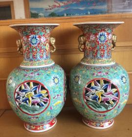 手绘粉彩花开富贵赏瓶一对
