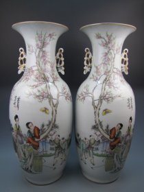 清粉彩人物故事双耳赏瓶一对
