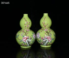 珍藏清代雍正绿釉粉彩花鸟葫芦瓶一对
