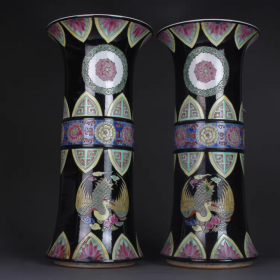 清黑地古彩粉彩手绘花觚瓶一对