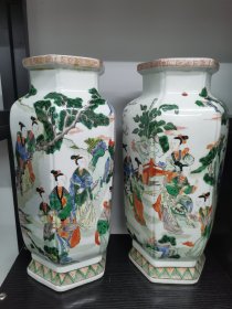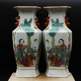 粉彩手绘人物六方瓶一对