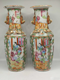 清粉彩手绘人物纹接耳瓶一对