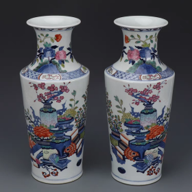 大清康熙粉彩人物故事纹棒槌瓶一对