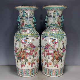 清粉彩手绘人物瓶一对
