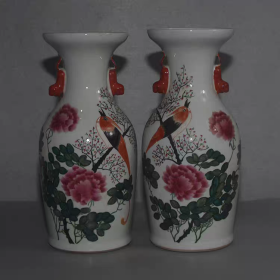 清粉彩花鸟纹双耳赏瓶一对