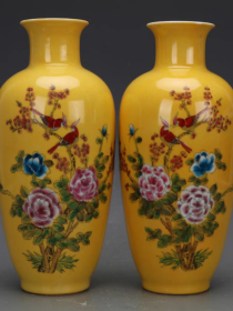清粉彩手绘黄地喜上眉梢观音瓶一对