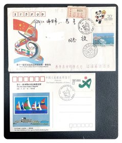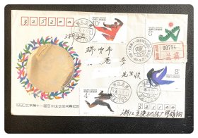“J”字头纪念邮票实寄封:中国集邮总公司《1990·北京第十一届亚运会开幕》纪念封,正背面贴J.151(2-1)及J.172共6枚邮票,J.172发行首日浙江兰溪缪鹤翔先生寄瑞安