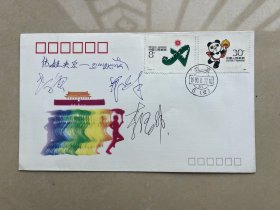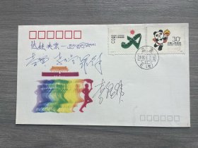 005 曾任北京市建工局副局长 张百发 及赵景贤 1990年签名 《亚运之光》火炬接力邮资标签封一件(11*18.5cm) HXTX302289